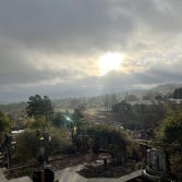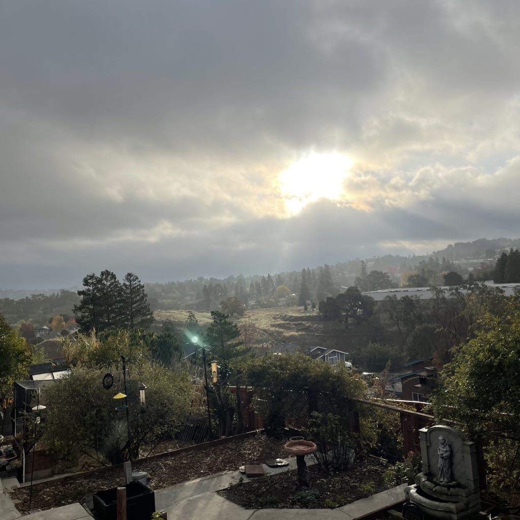 Bill and I sat on the deck and watched two squirrels playing this afternoon. They scrambled through the privet hedge canopy and flung themselves into Mike’s redwood tree. They chased each other around, up and down the trunk for ten minutes. They stopped on different branches to scold and wave their tails at each other before restarting the game.