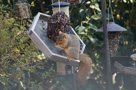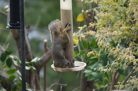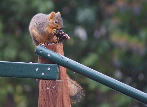 This morning, a squirrel dragged branches from different parts of the hedge to a spot eye-level with my office window. Through binoculars, I saw that she had created a base of woven branches for a nest. All day, I caught glimpses of her hauling more branches to the spot. Gradually, the structure grew to the size of a basketball.